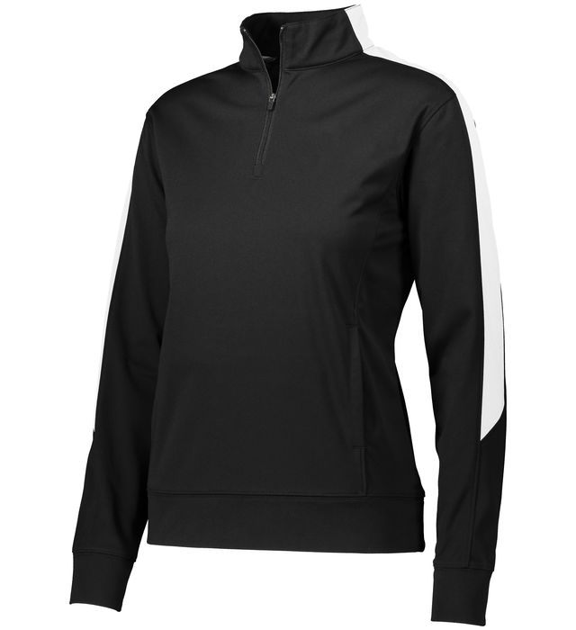 Heavyweight 100% polyester matte brushed tricot * Ladies' fit * Tagless label * Quarter zip pullover style * Contrast color inserts * Set-in sleeves * Front pouch pockets * Self-fabric cuffs and bottom band