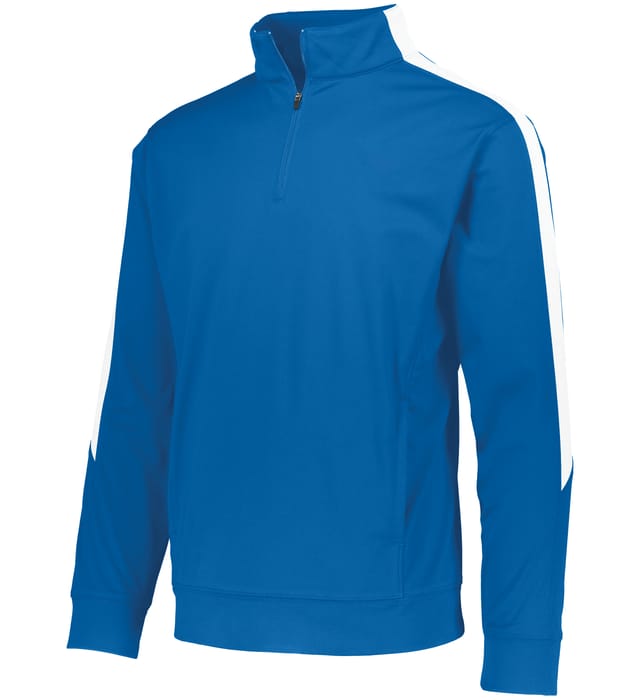 Heavyweight 100% polyester matte brushed tricot * Tagless label * Quarter zip pullover style * Contrast color inserts * Set-in sleeves * Front pouch pockets * Self-fabric cuffs and bottom band